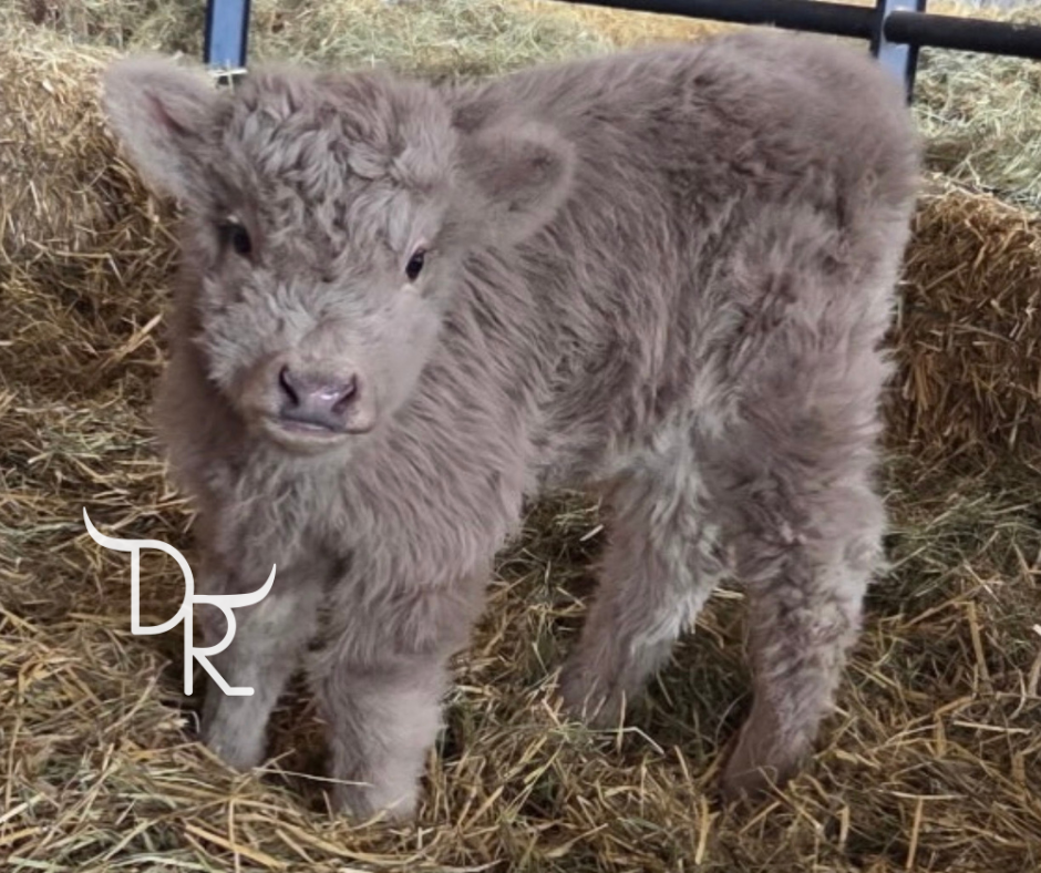 DR Harley and our bull Bracken made this beautiful, unique silver heifer and she is just absolutely stunning! From her feminine structure to her cute little white spark on her forehead, she is going to make a wonderful foundation female for a breeding program or a lovely pet for someone. She is 87.5% highland, non-chondro, and we anticipate her being mini or mid-mini at maturity. Thia will be available at weaning.